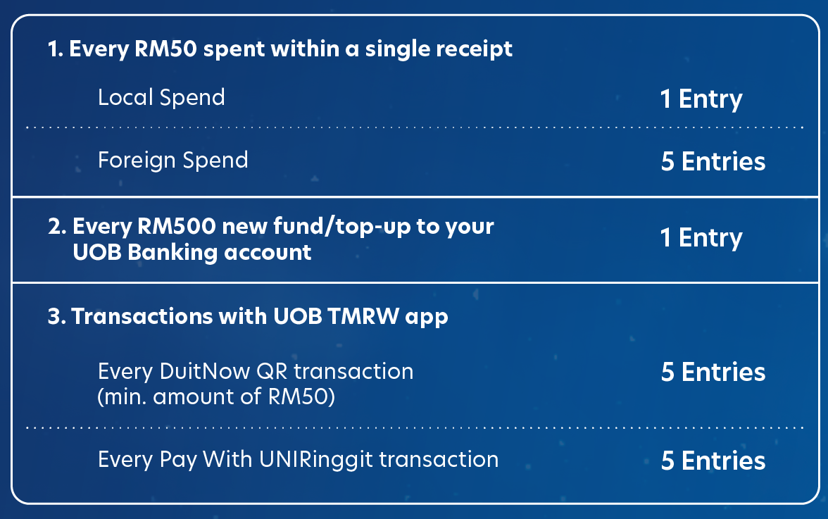When you spend on your UOB Card, make a deposit into your UOB Banking account or transact via UOB TMRW app, you earn chances to win!